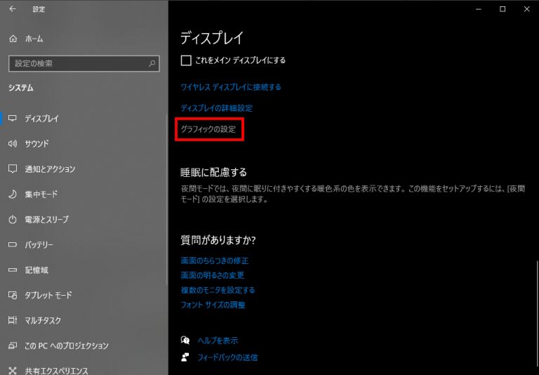 画面の下のほうにある「グラフィックスの設定」の文字をクリックすると、
