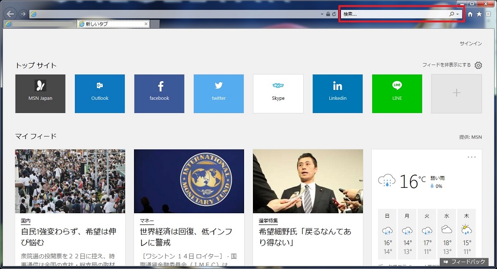 新しいタブを開いたときに、天気予報やニュースが表示される機能。Microsoft Edge (Windows 10の標準ブラウザー)の機能がそのままIEにも入った機能。